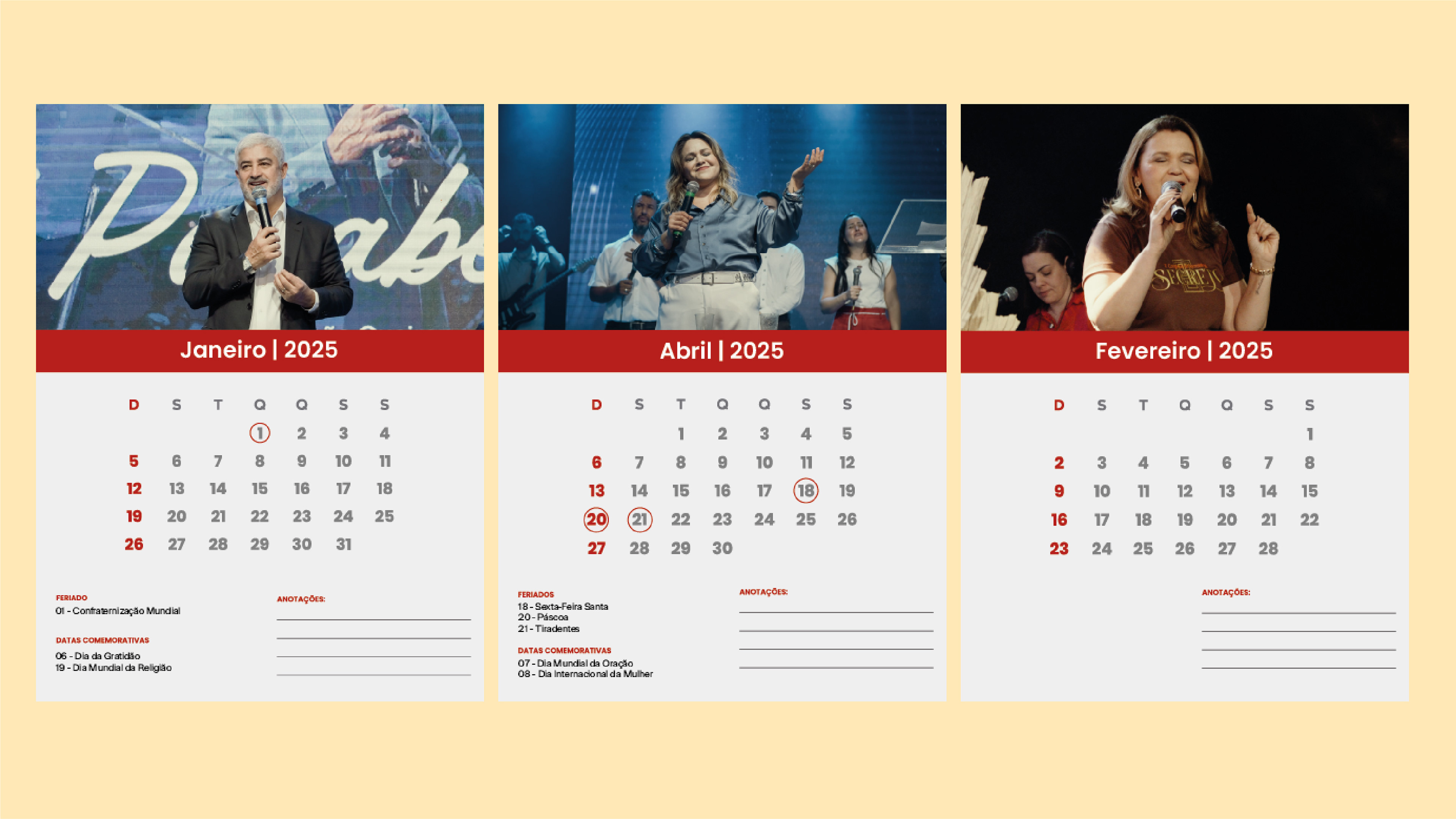 Além disso, foram desenvolvidos materiais diversos como calendários, planos de leitura bíblica, camisetas e cadernos personalizados, reforçando a aplicação prática da identidade no cotidiano da comunidade. O layout segue uma lógica modular, permitindo adaptações para diferentes formatos e plataformas, mantendo unidade visual sem perder flexibilidade. O uso de texturas, gradientes e sobreposições também contribui para uma atmosfera vibrante e espiritual, alinhada ao tema proposto.