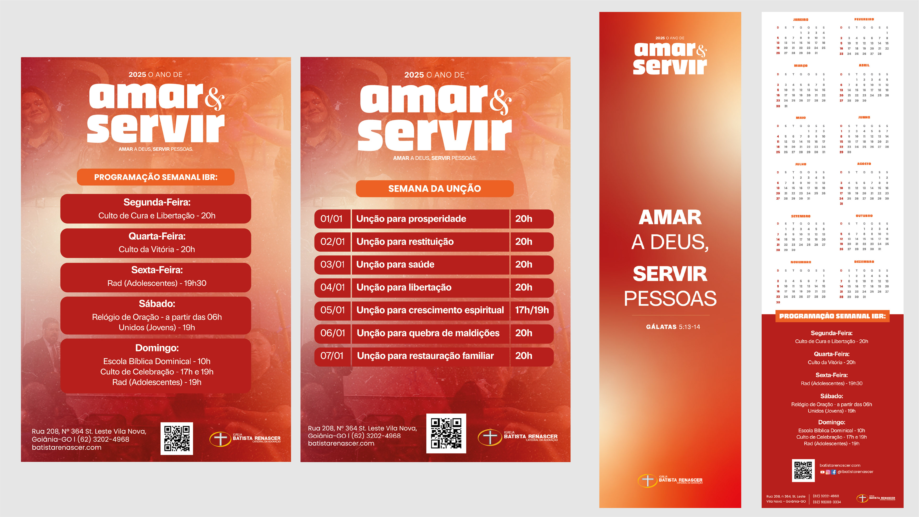 A identidade visual desenvolvida para o ano de 2025 da Igreja Batista Renascer parte do conceito central “Amar & Servir”, traduzido graficamente por uma paleta quente, que evoca o calor da presença de Deus, a energia da missão e o acolhimento comunitário. A escolha tipográfica combina peso e suavidade, representando firmeza na fé e sensibilidade no serviço ao próximo. Cada elemento visual foi pensado para dialogar diretamente com a vivência da igreja, tornando a mensagem clara, acessível e emocionalmente impactante.
